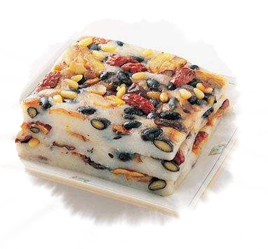 重阳糕又称花糕、菊糕、五色糕,制无定法,较为随意。农历九月九日天明时,以片糕搭儿女头额,口中念念有词,祝愿子女百事俱高,乃古人九月作糕的本意。讲究的重阳糕要做成九层,像座宝塔,上面还做成两只小羊,以符合重阳(羊)之义。有的还在重阳糕上插一小红纸旗,并点蜡烛灯。这大概是用“点灯”、“吃糕”代替“登高”的意思,用小红纸旗代替茱萸。当今的重阳糕,仍无固定品种,各地在重阳节吃的松软糕类都称之为重阳糕。