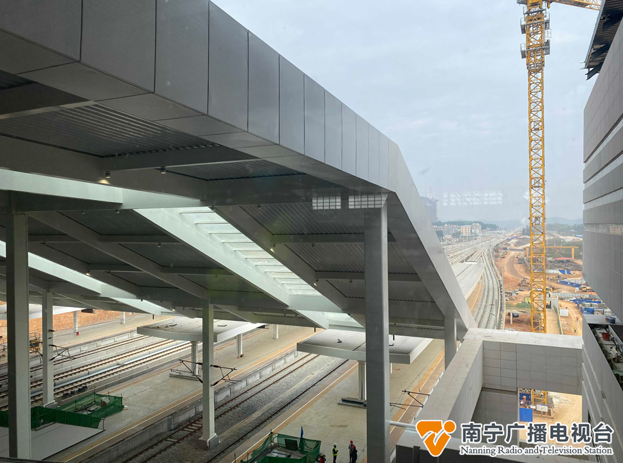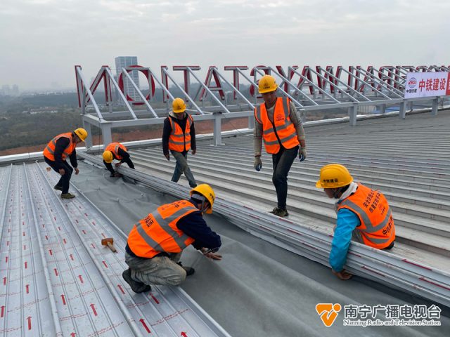 云桂铁路广西有限责任公司站房专业高级工程师卢其峰说:“南宁北站金属屋面共4.35万平方米,由5600余块铝镁锰金属屋面板拼接组成,具有外观美、重量轻、耐腐蚀、防雷避雷效果好等优势。施工过程中,我们采用先进的直立锁边工艺,使屋面更加结实耐用,施工效率较以往人工拼接提升了50%,使站房较计划提前15天封顶。”