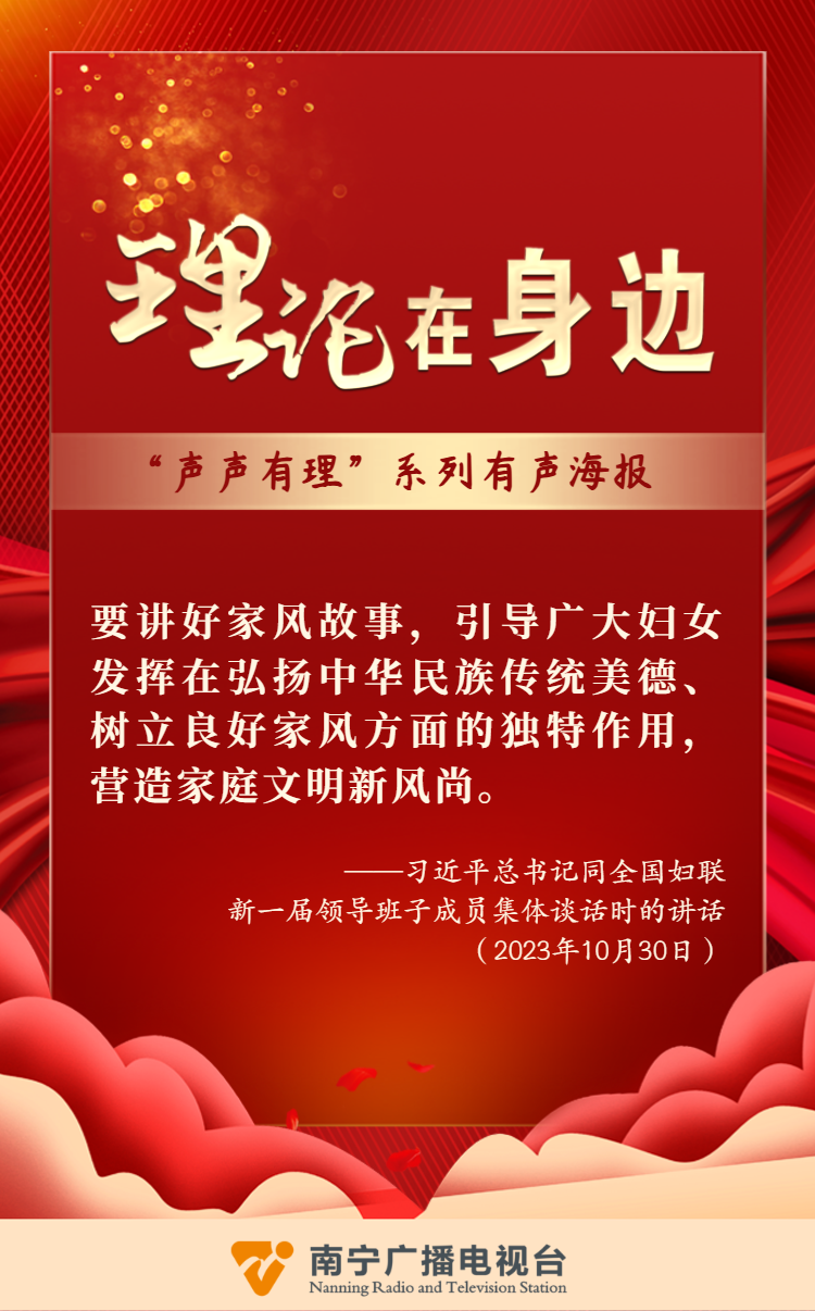 要讲好家风故事,引导广大妇女发挥在弘扬中华民族传统美德、树立良好家风方面的独特作用,营造家庭文明新风尚。 ——习近平总书记同全国妇联新一届领导班子成员集体谈话时的讲话(2023年10月30日)