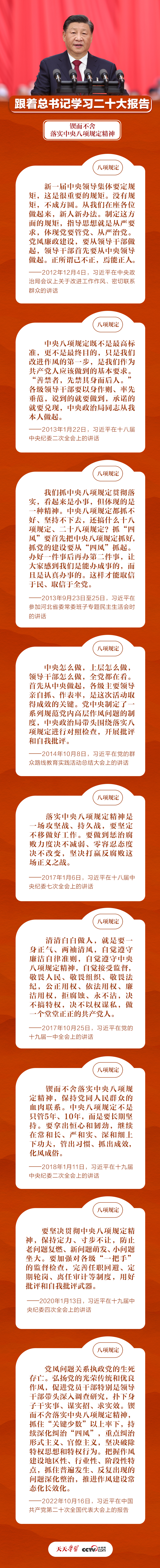 党的二十大报告对锲而不舍落实中央八项规定精神作出新部署,要求“抓住‘关键少数’以上率下,持续深化纠治‘四风’,重点纠治形式主义、官僚主义,坚决破除特权思想和特权行为”。