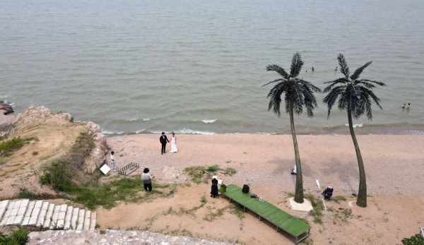 ↑2022年7月17日,市民在巢湖岸线拍摄婚纱照(无人机照片)。