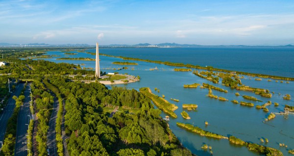 2022年7月底,环巢湖十大湿地全面建成。从空中俯瞰,巢湖宛若银盘镶嵌于安徽大地,环巢湖十大湿地如同一块块翡翠“串珠成链”,筑起环巢湖水生态、水安全屏障。