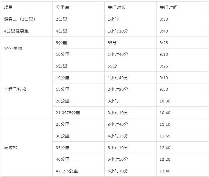 关门时间按自然时间计算,具体见下表(按上午7:30鸣枪起跑):