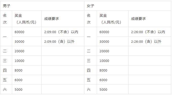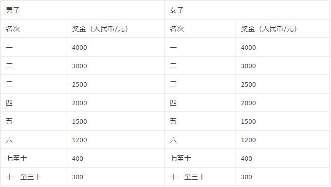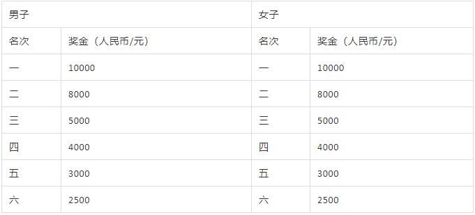 男、女第1至第6名运动员分别获得奖金(见下表)