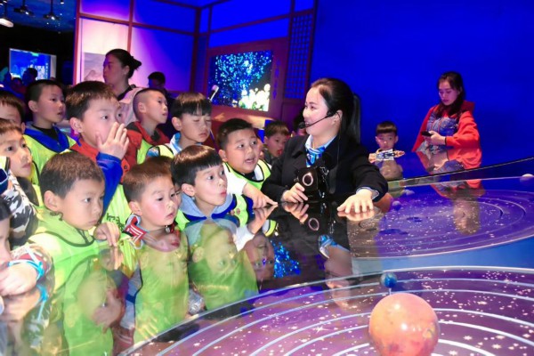 学生们在位于贵州省平塘县克度镇的天文体验馆内研学。中国天眼科普基地供图