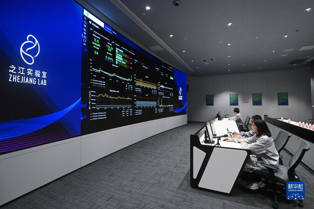 在之江实验室计算与数据中心,工程师们通过“之江云”系统监测服务器集群的运行状态(2022年6月23日摄)。新华社记者 黄宗治摄