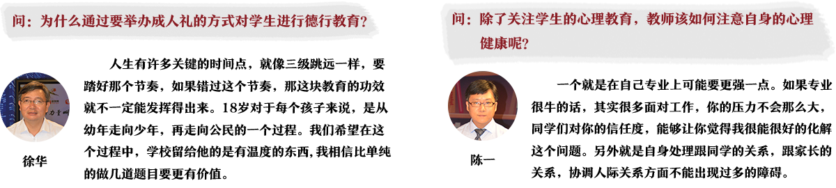 主持人:在直播节目当中,有很多的网友跟我们进行了互动,发来了些问题,我们来看看大家是怎么说的。有位同学问徐华老师,为什么通过要举办成人礼的方式对学生进行德行教育?
