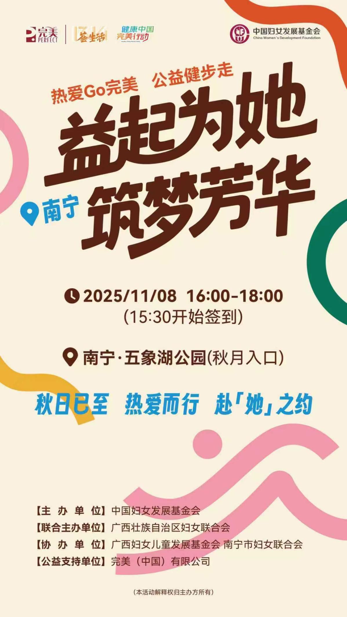 完美公司联合多家国家级基金会,发起2025“完美公益健步走”系列活动!本次南宁站将集结奥运冠军领走,设置3-5公里城市风景路线,沿途设有补给站与趣味互动区,融合地方特色表演、亲子游戏与公益展示。参与者可领取能量包、完赛奖牌,边运动边做公益,共同助力健康中国!锁定我们的直播间,一起为爱行走!
