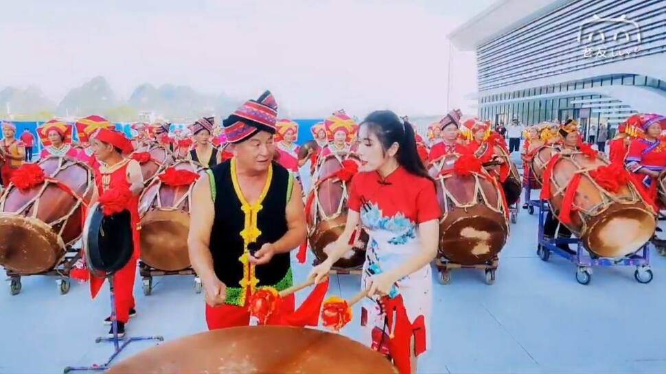 马山县群众敲起激昂的会鼓庆贺贵南高铁开通