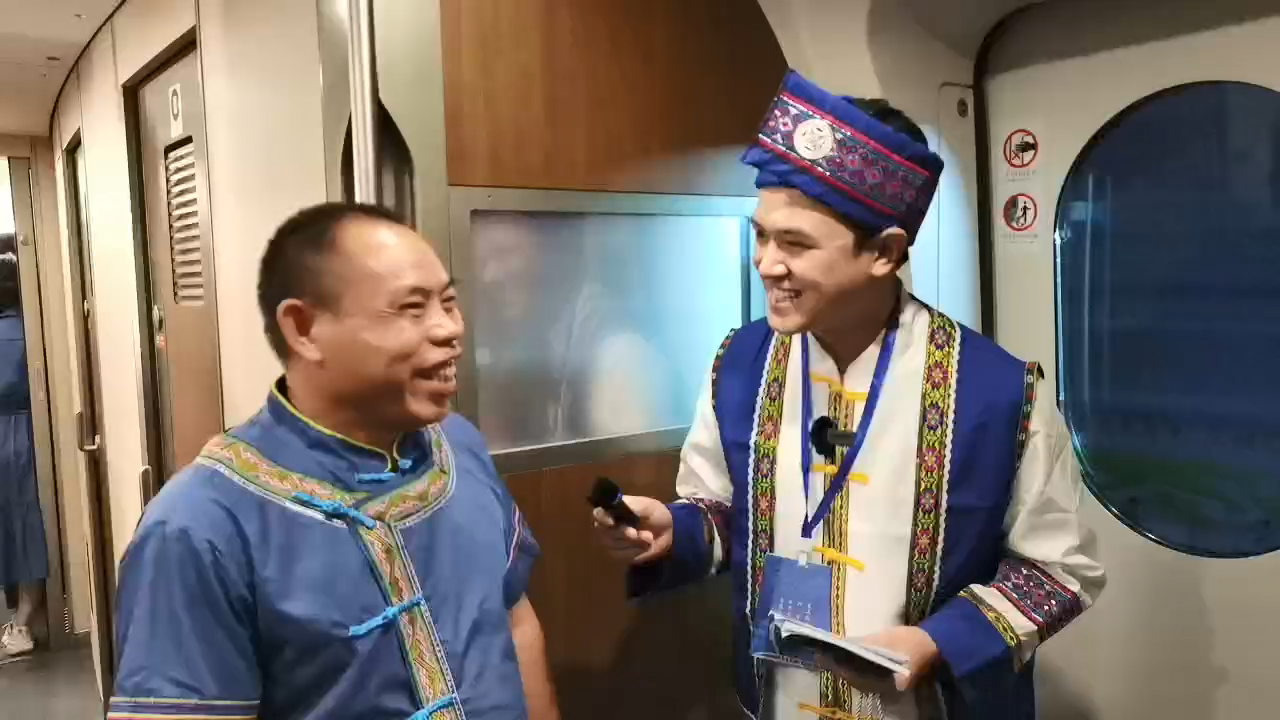 谭会权(左)在今天开行的首趟列车上接受本台记者采访